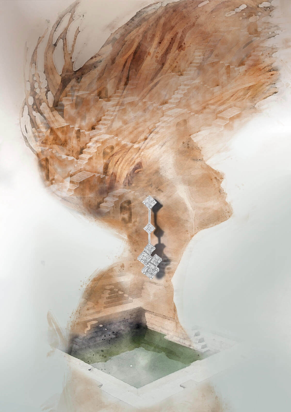 Its visual vocabulary seamlessly interprets architectural elements from India’s ancient stepwells into a unique design language. Manifesting itself as a versatile selection of rings, earrings, neckpieces and bracelets.
